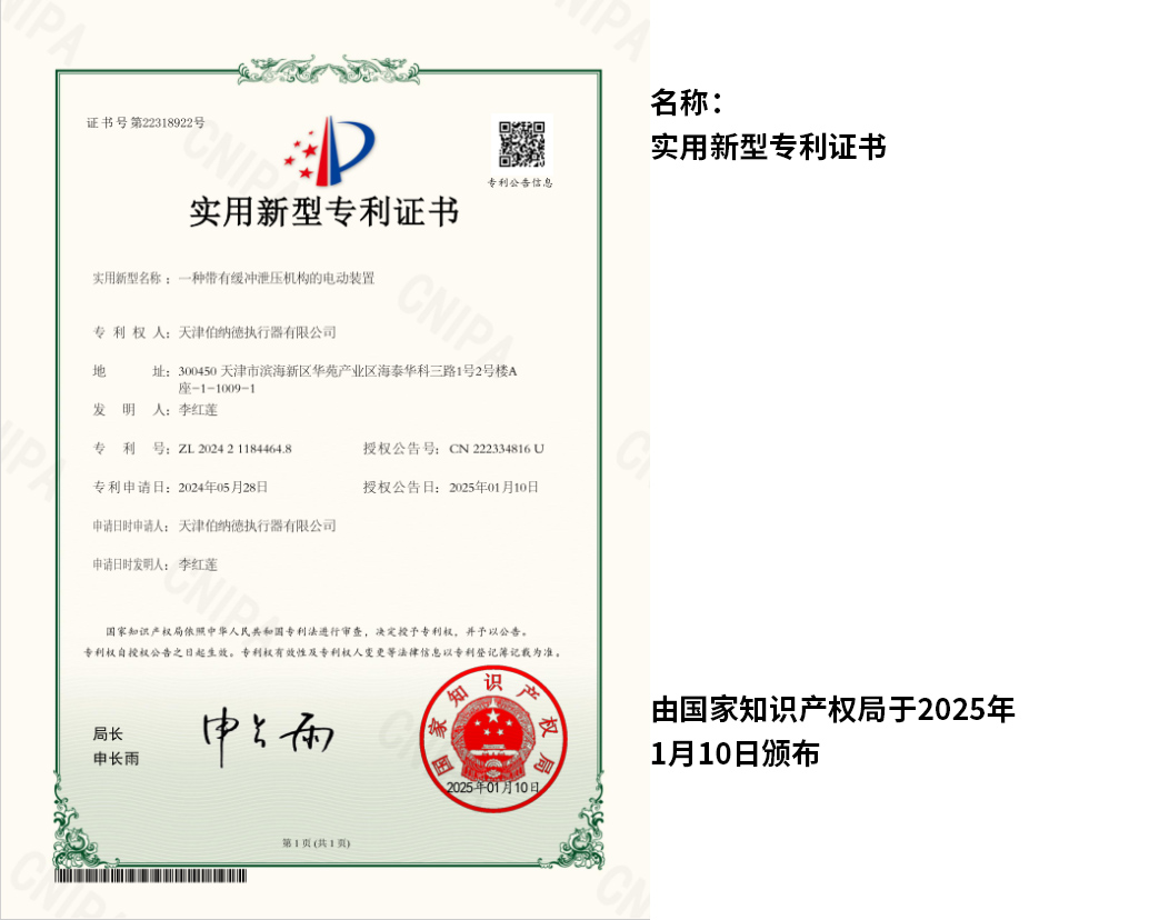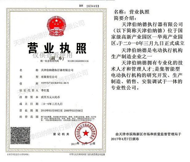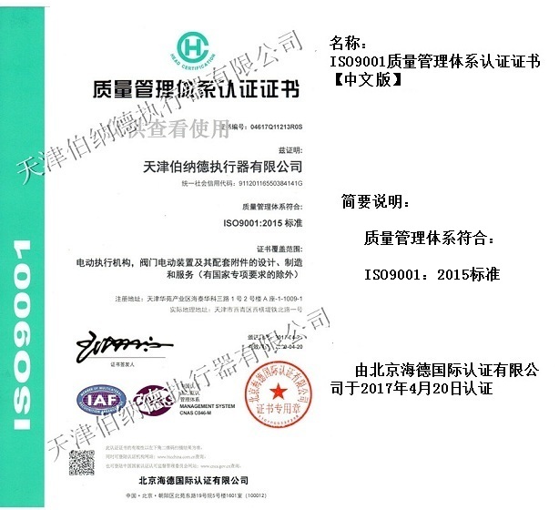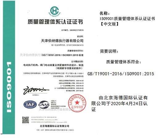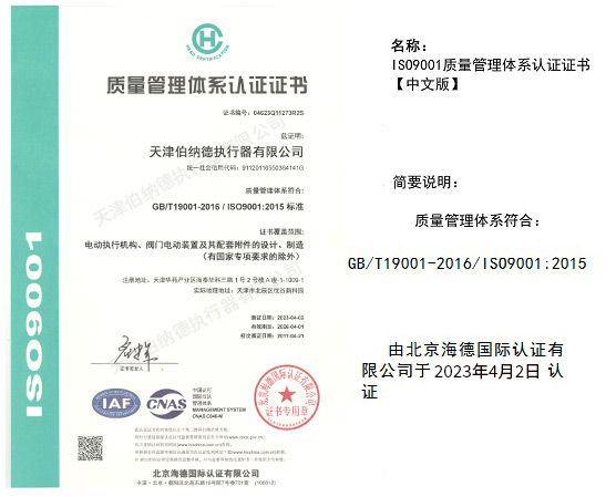 天津伯纳德执行器有限公司(以下简称天津伯纳德)位于国家级高新产业园区—华苑产业园区,是受国家扶持的高新技术企业,并多次荣获了“国家级高新技术企业认证”和“天津市市级高新技术企业认证”和“全国科技型中小企业”、“天津市科技型中小企业认证”。天津伯纳德拥有专业化的技术人才和管理人才,是集智能型电动执行机构的研究开发、生产制造、销售、安装调试于一体的专业性公司。公司制造加工采用专业的加工、数字研发设备,采用专业检测设备。天津伯纳德的技术质量不断进行技术开发,拥有国际“ISO9001:2015质量管理体系认证”,欧盟市场认证产品的“CE认证”,俄罗斯认...
